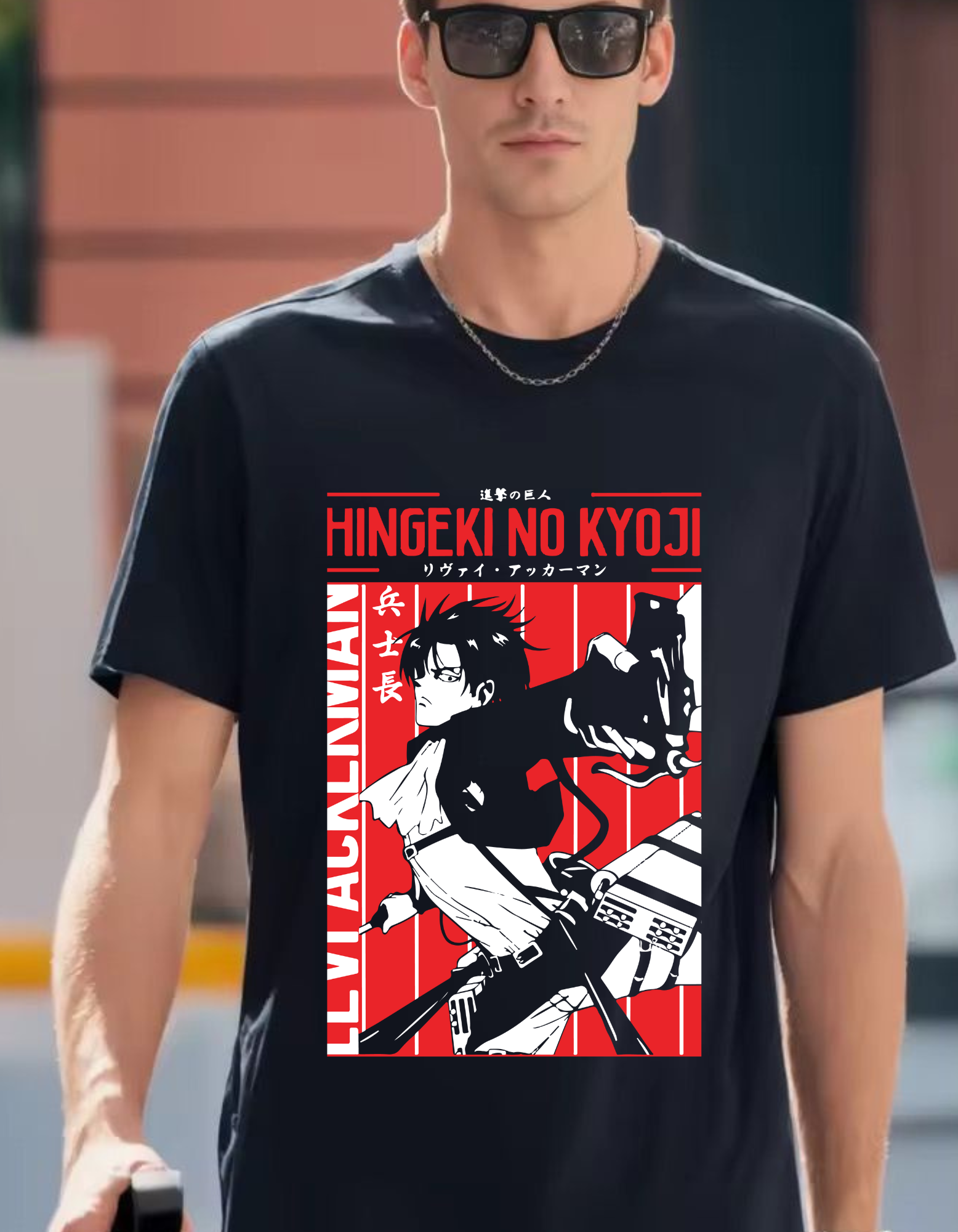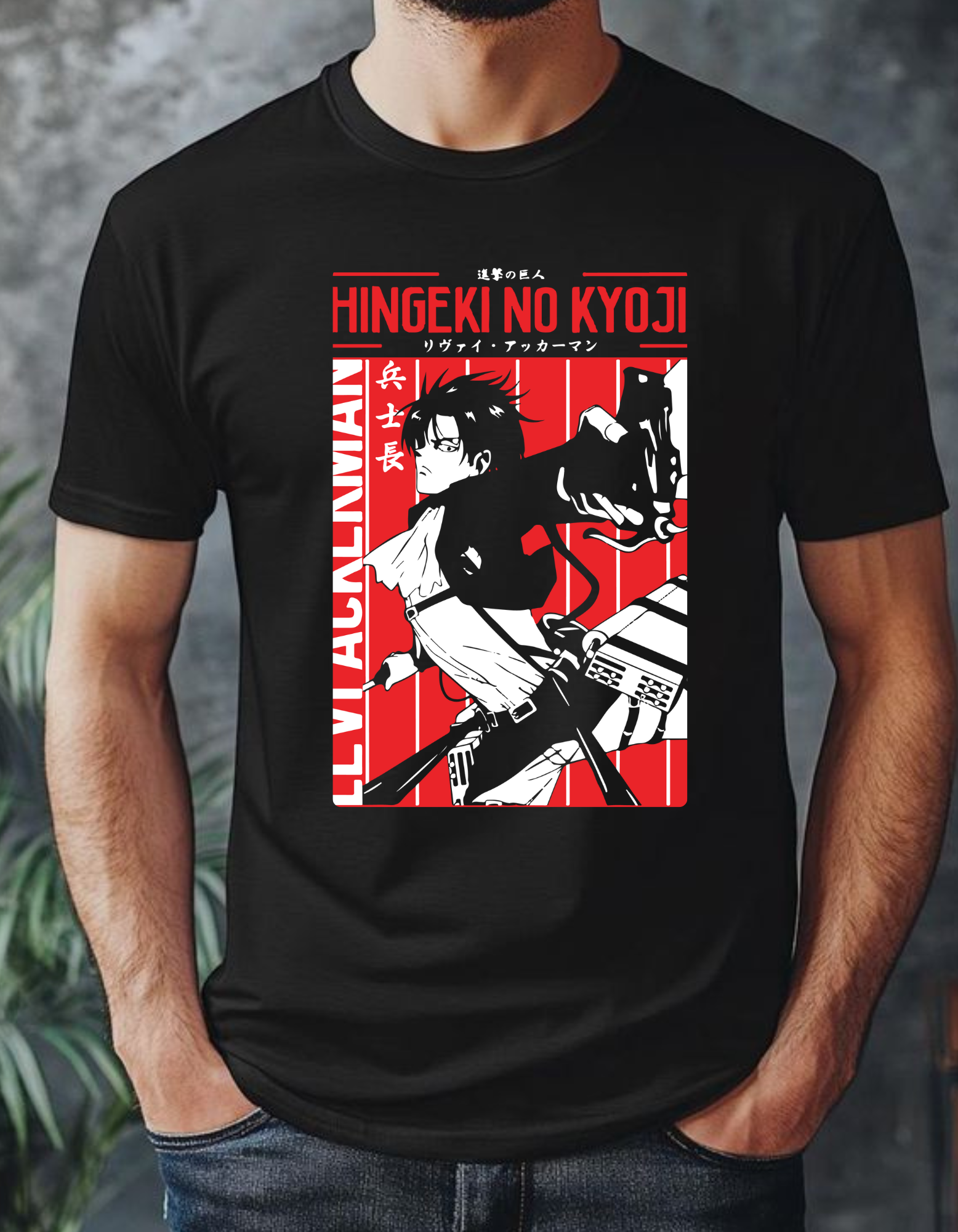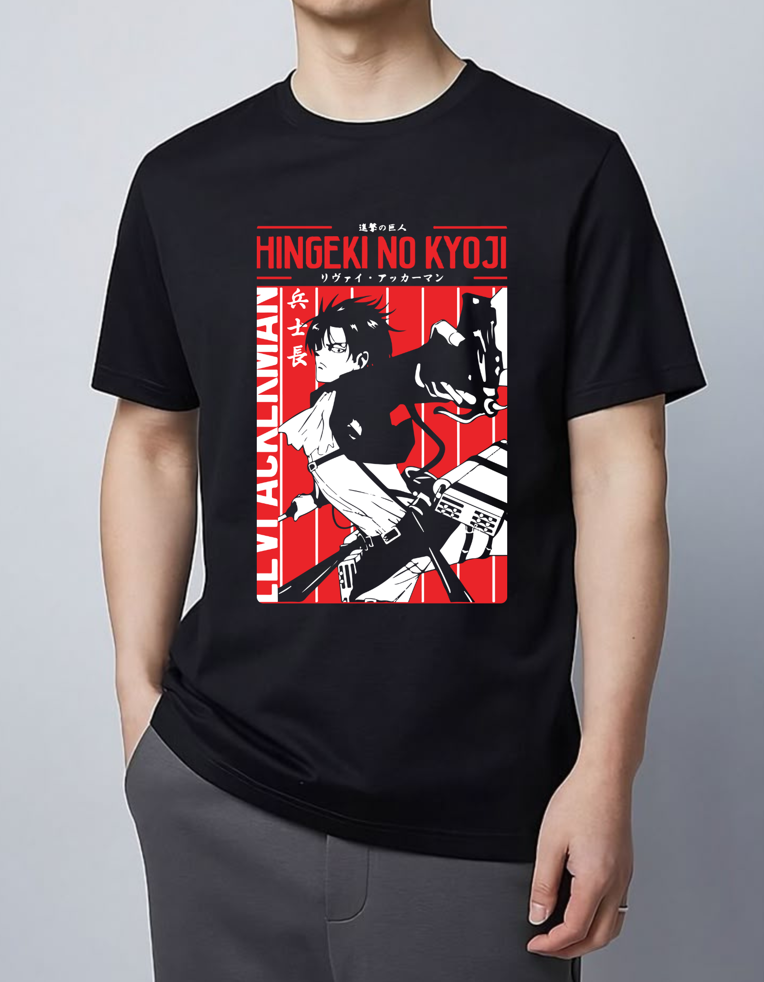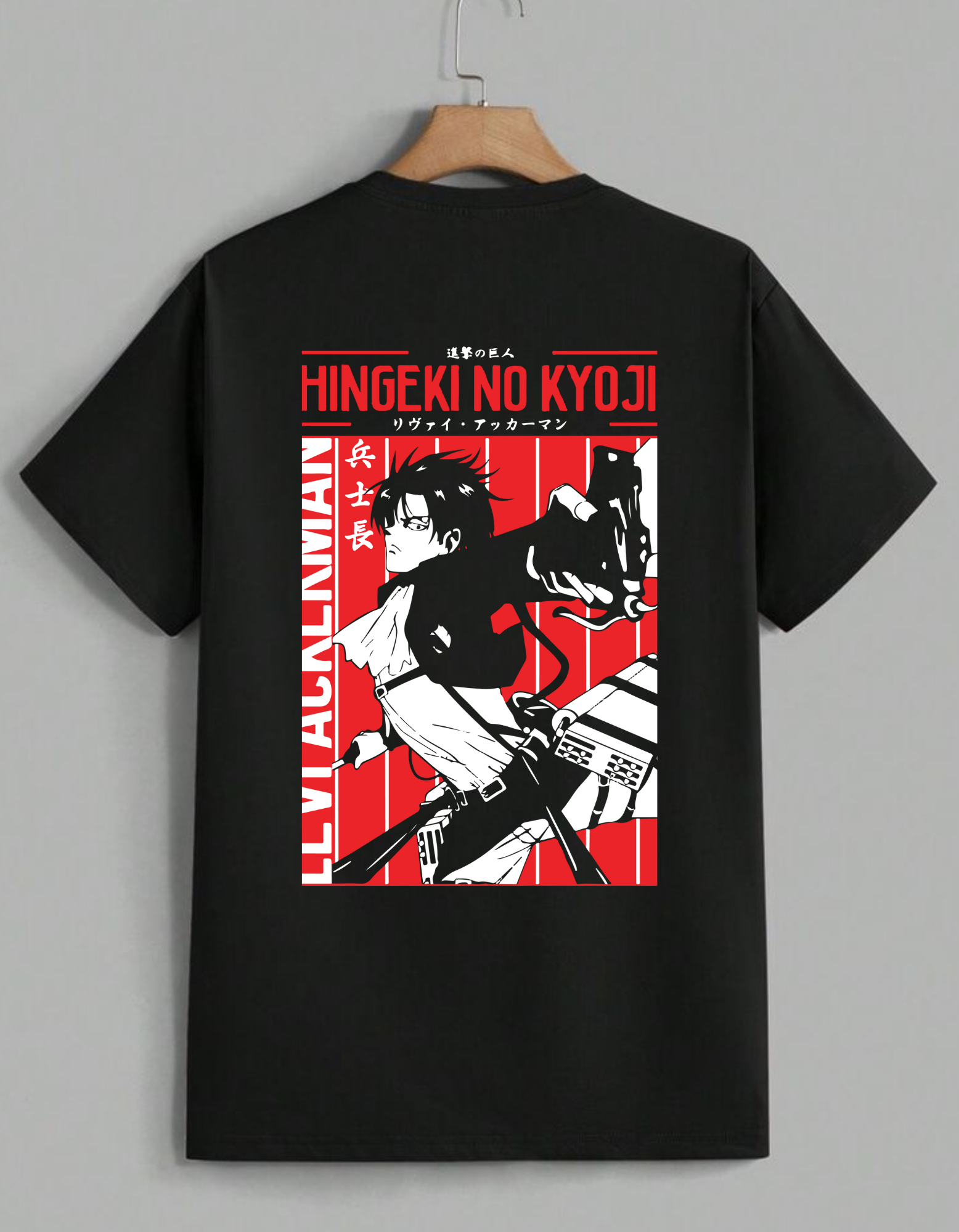 This bold Attack on Titan tee showcases humanity's strongest soldier in full motion. The red-black contrast and Japanese typography give it a raw, anime-meets-streetwear energy — perfect for fans who move sharp, speak less, and strike hard.