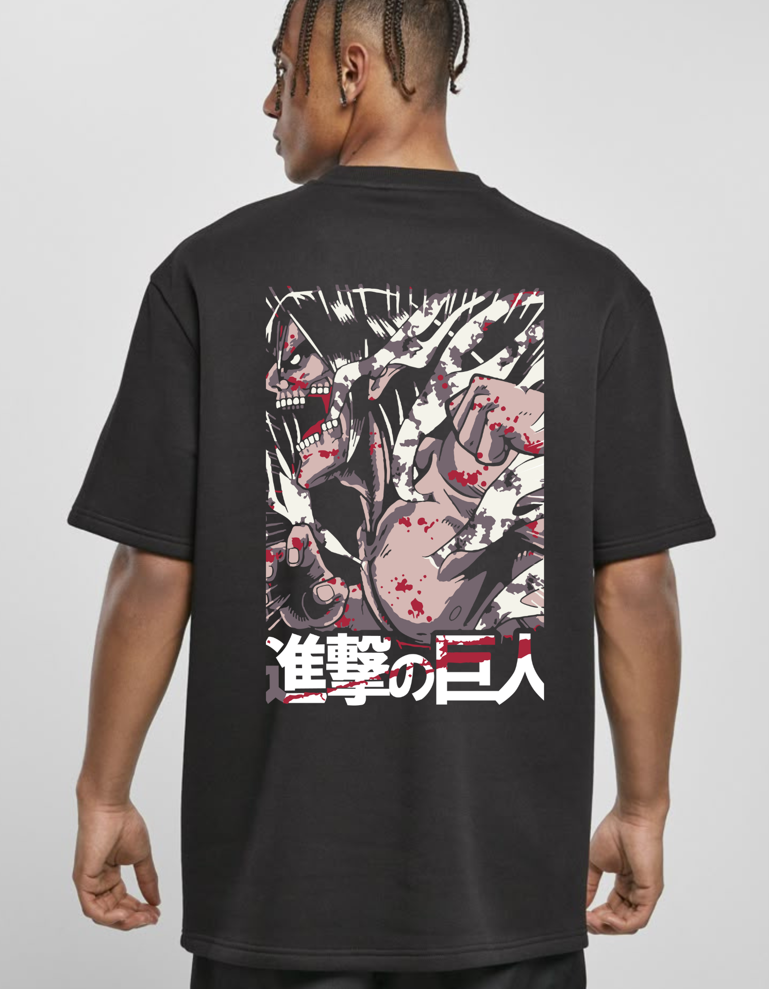 This tee isn’t for the faint of heart. Featuring the savage, rage-fueled form of Eren’s Titan — covered in blood and chaos — this back print shouts raw power, revenge, and rebellion. If you're not just a fan but part of the fight, this one’s for you.