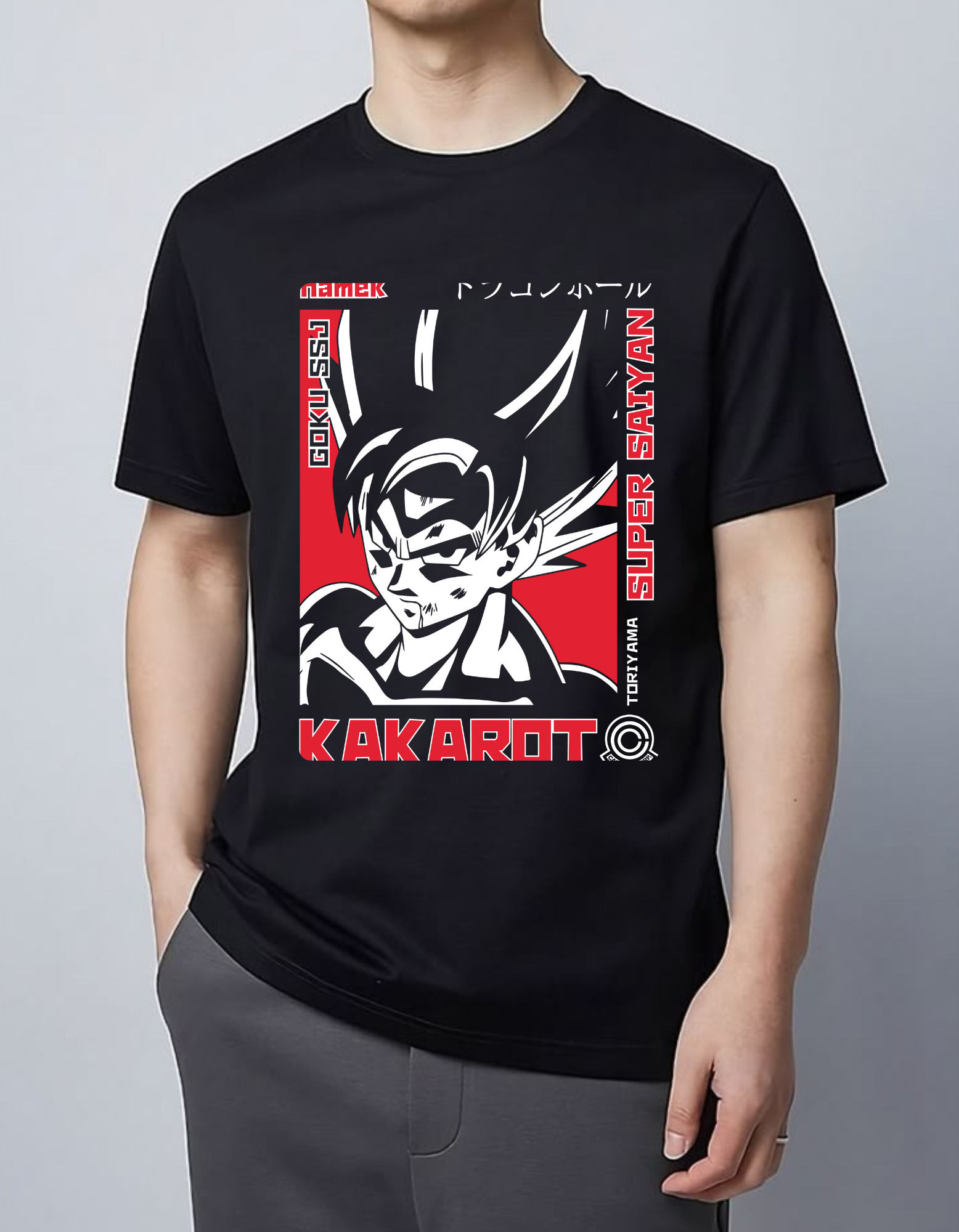 Stand out with this bold Kakarot Super Saiyan tee. Featuring striking red, black, and white artwork inspired by Goku’s Namek Saga transformation, it's the perfect fusion of style and power. For true Dragon Ball fans.