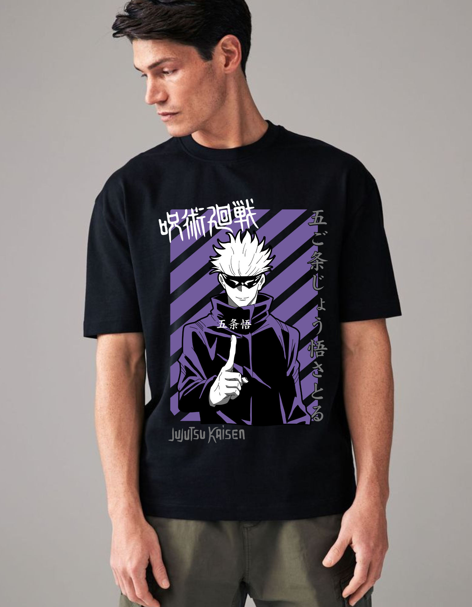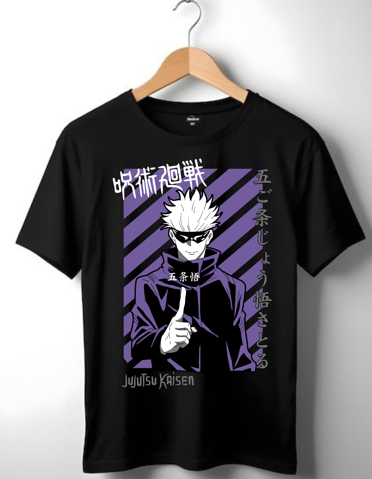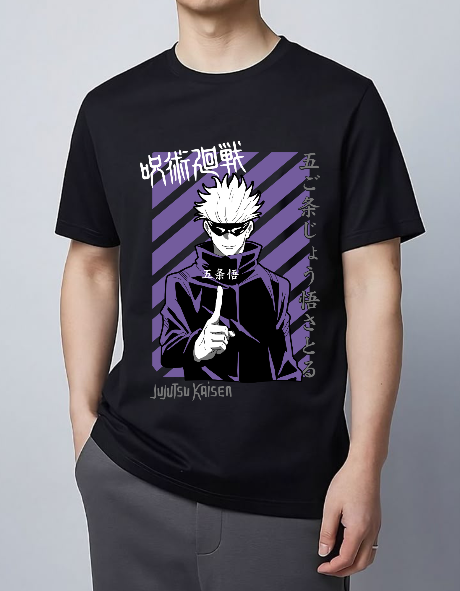 Rule the streets like the strongest sorcerer with this Gojo Satoru t-shirt โ a perfect blend of sleek purple tones, powerful posture, and minimalist Japanese typography. This is not just merch, itโs a statement of dominance and cool.